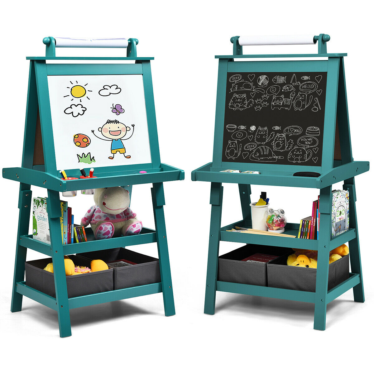 Costzon 2 In 1 Kids Wooden Art Easel Hight Adjustable Double Side Pine Wood Standing Easel W Large Storage Tray Paper Roll