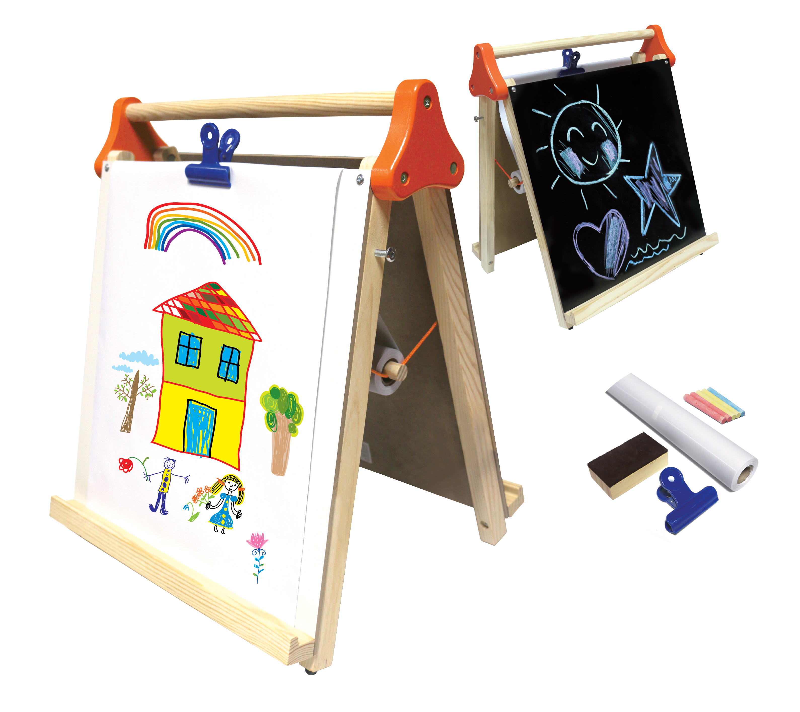 More space for more imagination. There is a handy rollout dispenser at the top that can be stocked with paper for an added drawing medium. This crayola wooden art easel is double sided with a dry erase surface and a chalkboard surface.