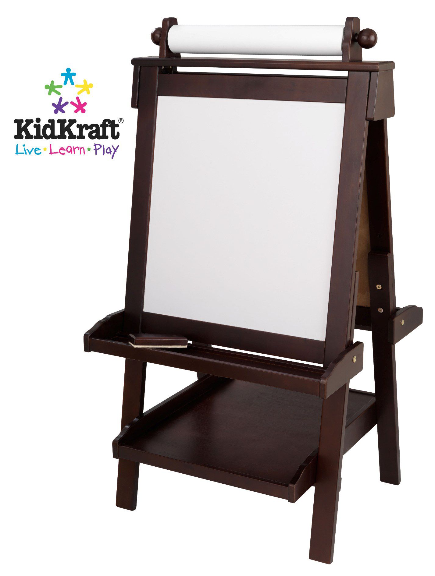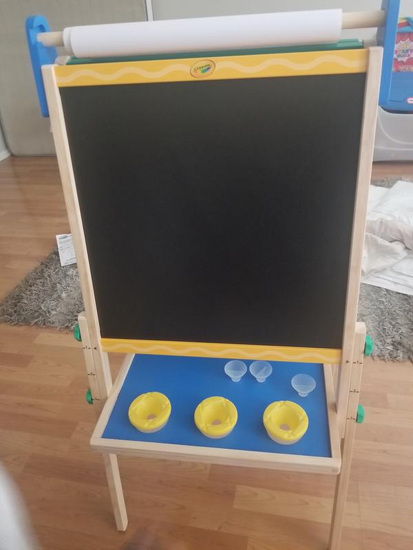 Storage on the shelf and in the pots helps keep supplies organized. Crayola kids wooden art easel is the perfect tool to help kids create and display their colourful designs. A handy rollout dispenser lets kids create on paper as well.