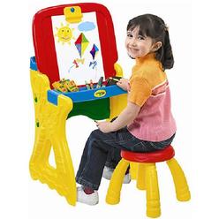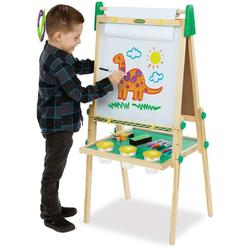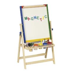 This multifaceted easel is dual sided with both dry erase and chalkboard surfaces. Compartmentalized tray keeps over 85 art supplies organized.