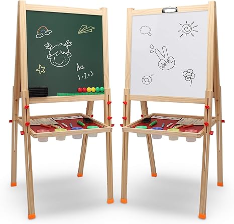 Amazon Com Techmoo Kids Wooden Art Easel Double Sided Whiteboard Chalkboard Adjustable Children Standing Dry Easel Board For Kids Toddlers Boys Girls Painting Drawing Home Kitchen