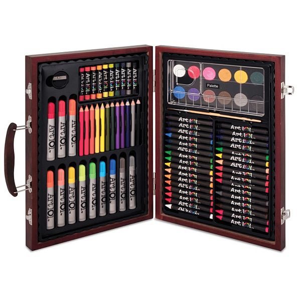 Draw paint and create with this 132 piece wooden case of art supplies this fully loaded set comes with 12 color pencils 60 crayons 24 oil pastels 24 watercolors 3 mixing palettes 2 paint brushes 2 sketch pencils 1 learning guide 1 color chart 1 pencil sharpener 1 eraser and a quality. Complete art set for hours of satisfying and creative fun. 142 piece wood art set.