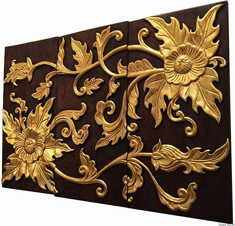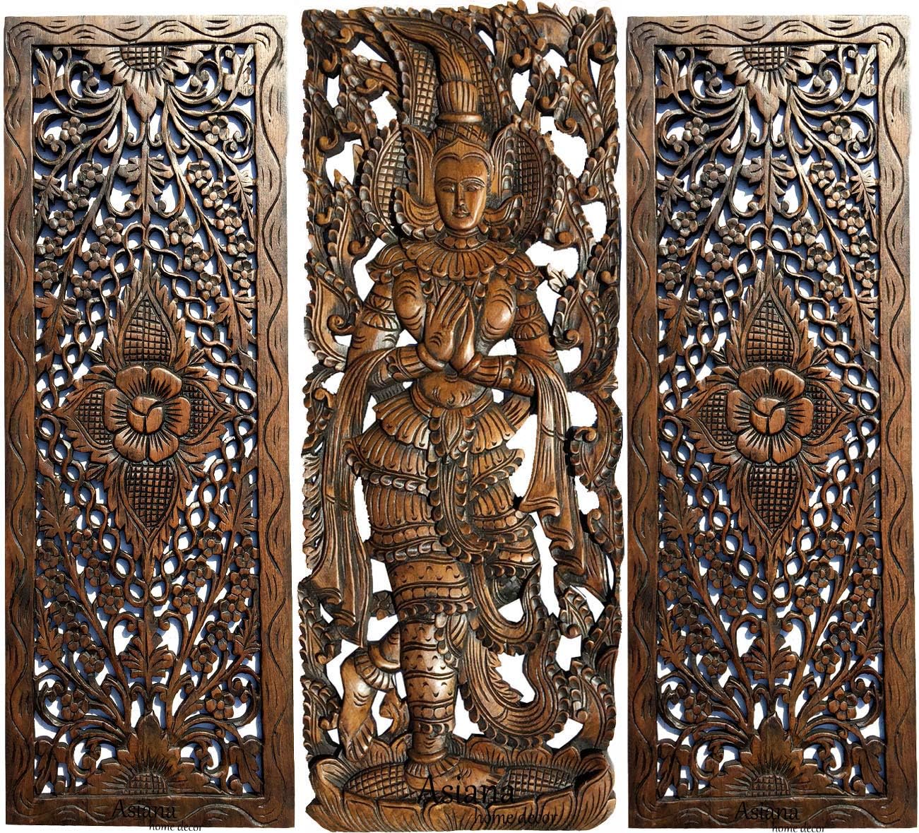 Amazon Com Sawaddee Thai Greeting Figure And Floral Wood Carving Wall Decor Panels Asian Home Decor Wall Art In Dark Brown Finish 35 5 X13 5 Each Set Of 3 Pcs Figure A Everything Else
