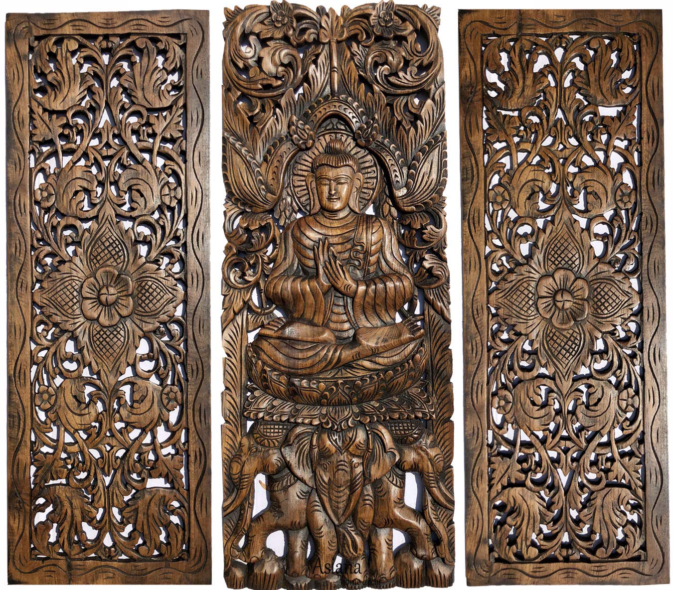 Buddha And Floral Carved Wood Wall Decor Panels Asian Home Decor In Brown Finish 35 5 X13 5 Each Set Of 3 Pcs Buy Online In Mongolia At Mongolia Desertcart Com Productid 41268449