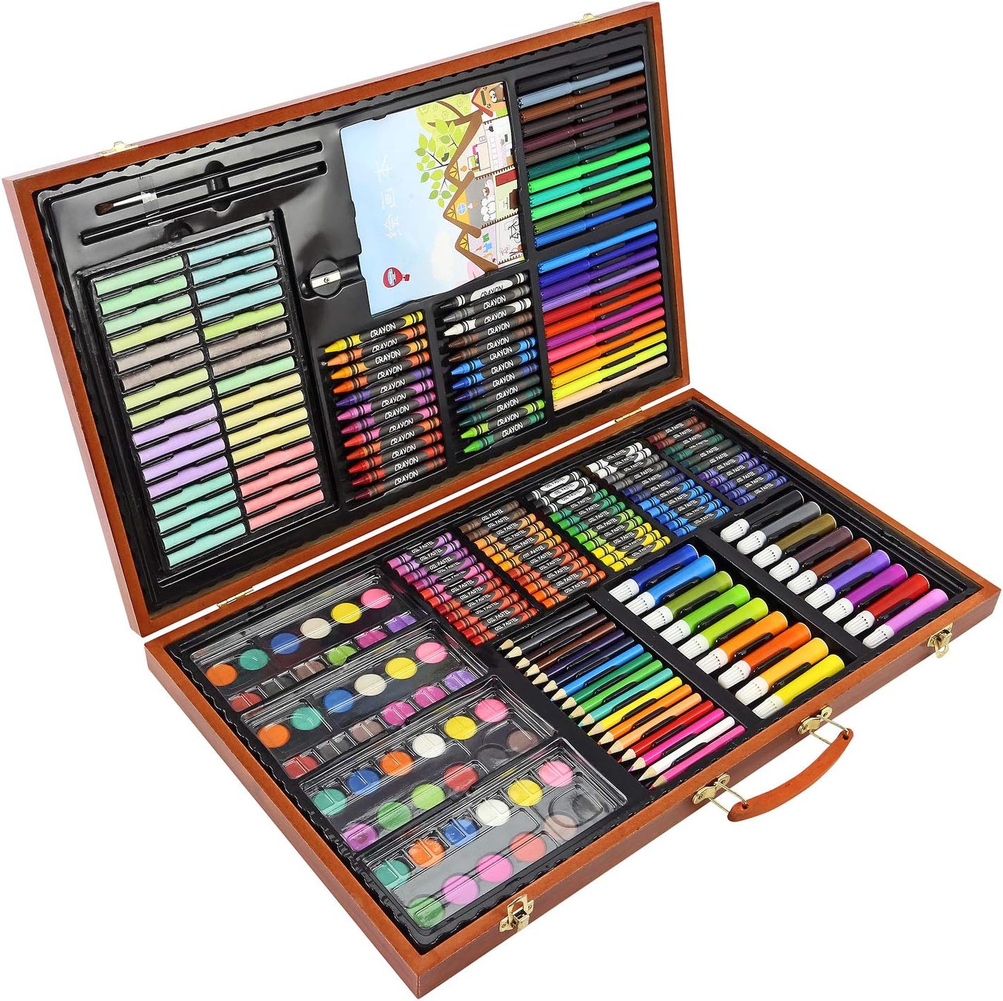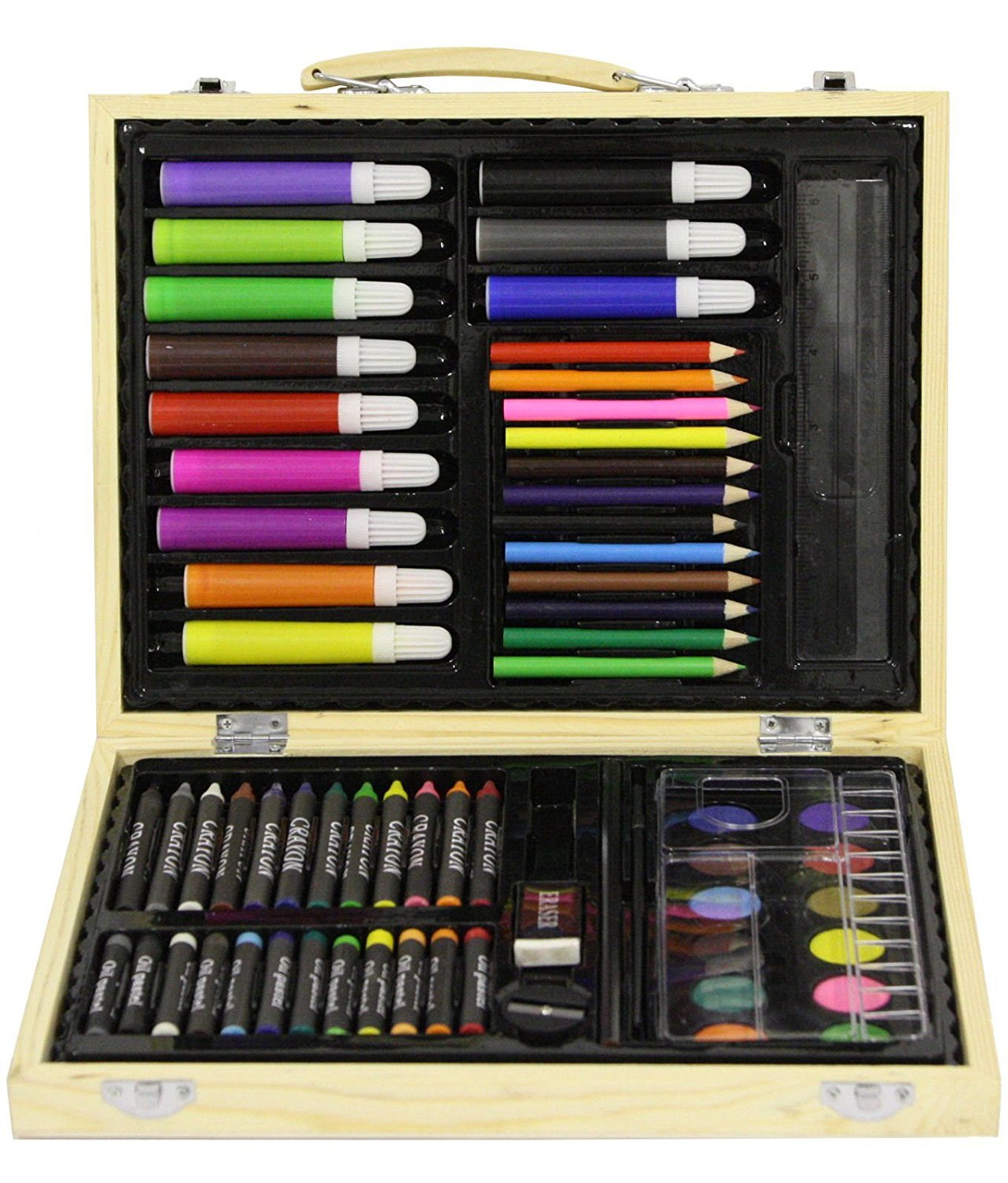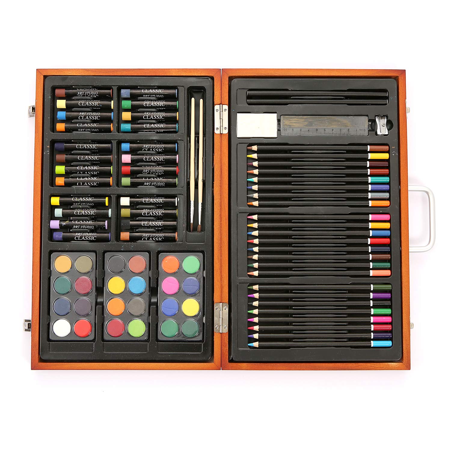 Amazon Com 102 Piece Deluxe Art Set 2 X 50 Page Sketch Book 1 X 24 Page Watercolor Pad Art Set In Portable Wooden Case Oil Pastels Colored Pencils Watercolor Cakes Sharpener Deluxe Art Set