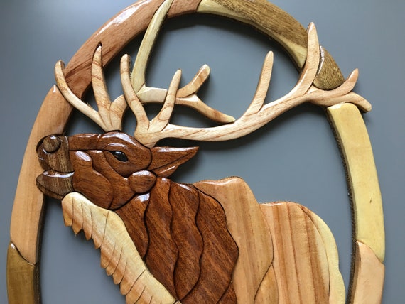 Wood Carving Wall Artdeer Ornamentwood Intarsiawood Etsy