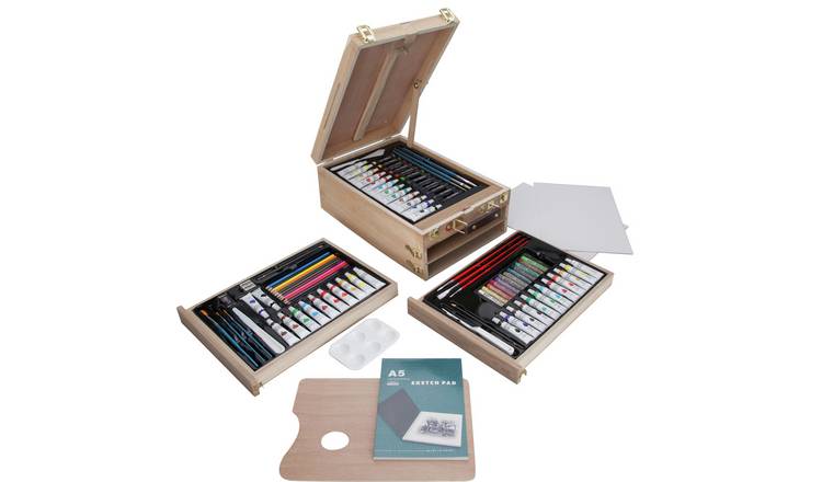 Complete art boxed sets. The 175 piece wooden art set has everything you need to paint in watercolours oils or acrylics. Give wings to your childrens colourful imagination or be inspired to create a masterpiece of your own with this 180 piece wooden art set.