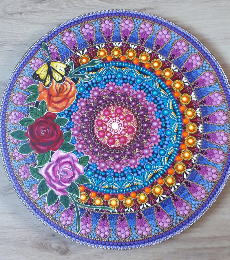 3 Roses Mandala On Wooden Board Etsy