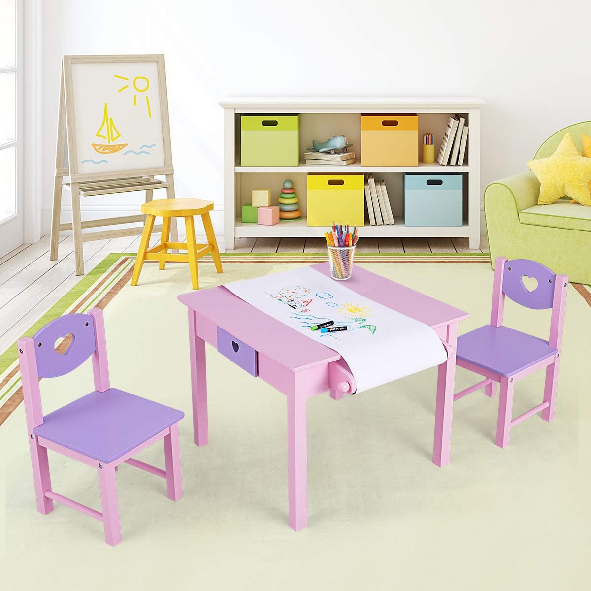 Costway Kids Table Chair Set With 2 Drawers Storage Paper Roll Rack Children Wooden Art Painting Desk 2 Chairs Set For Living Room Bedroom Pink Purple Buy Online In