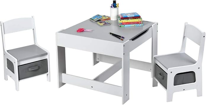 Costzon kids table and 2 chairs set 3 in 1 wooden table furniture for toddlers drawing reading train art playroom activity table desk sets convertible set with storage space 43 out of 5 stars 874. Easy to assemble 2 tone sturdy wooden art table with shelves 4 built in paint cup holders paper roll dispenser and 2 matching wooden chairs sized for kids. Sorelle imagination table chair set gray.
