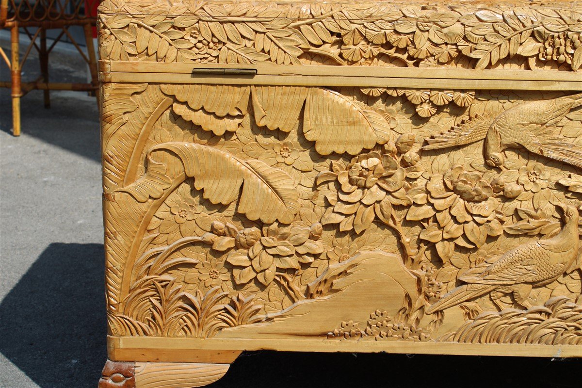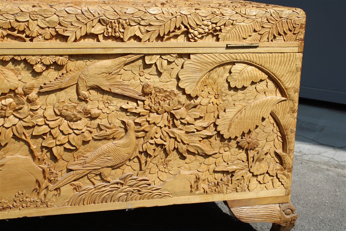 Vintage Hand Carved Maple Chest Trunk With Peacocks Birds And Lotus Flower 1940s For Sale At Pamono