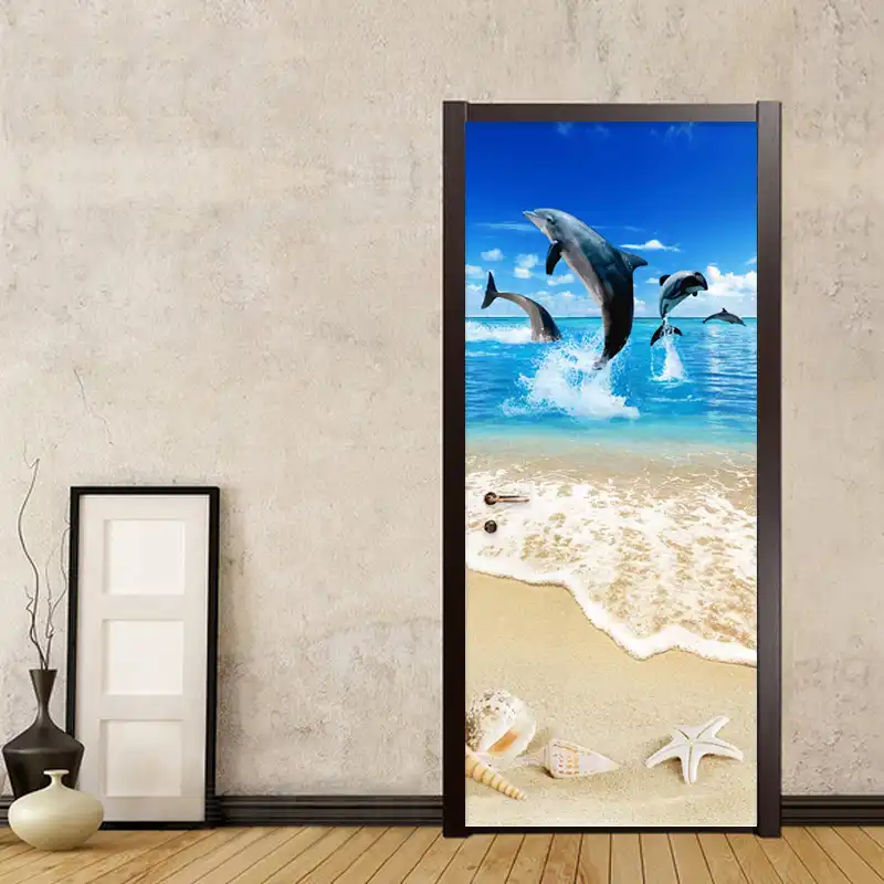 Pvc Self Adhesive Waterproof Door Sticker 3d Beach Dolphin Animal Wallpaper Living Room Toilet Door Stickers Home Decor 3d Paste Door Stickers Aliexpress